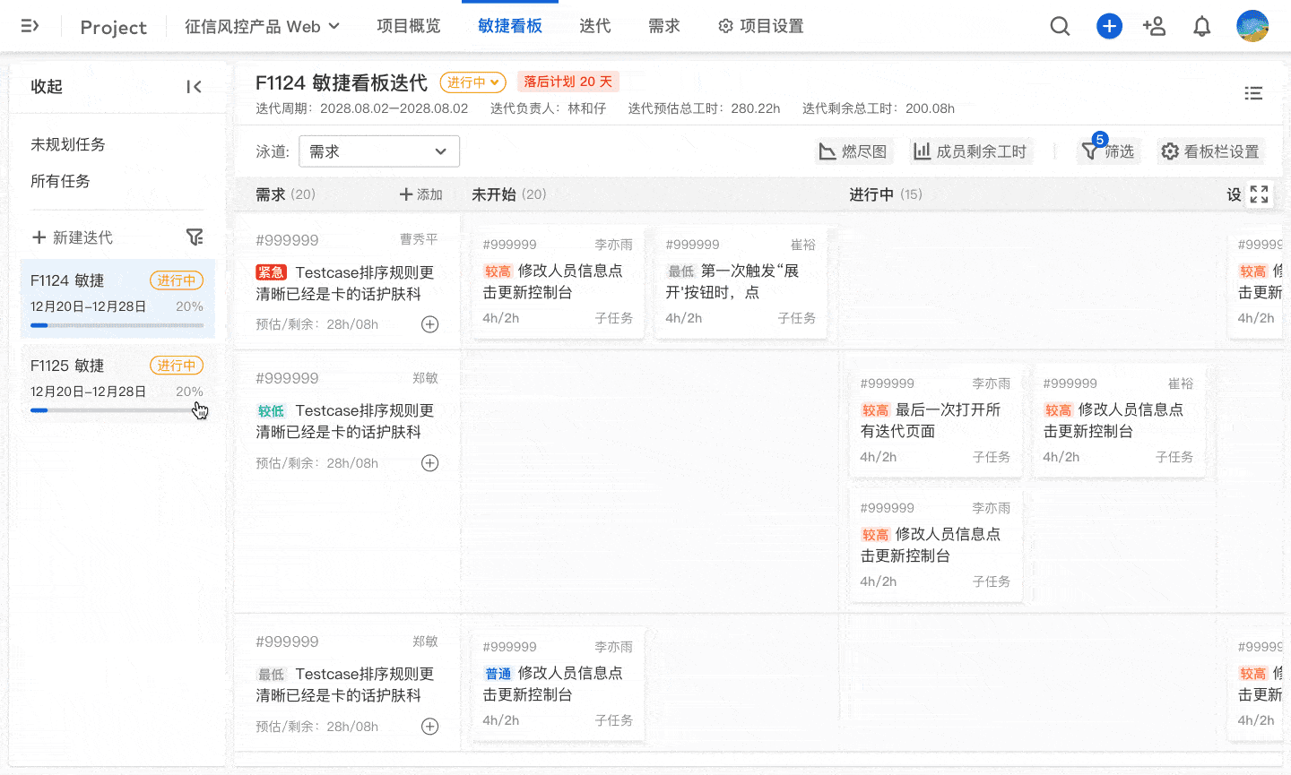 迭代过程中,团队成员围绕迭代要完成的需求完成自己拆解的任务,并通过敏捷看板管理任务状态;在每日站立会议中,可以借助敏捷看板以可视化的方式对齐迭代进度,与风险,排除问题。团队还可通过燃尽图直观地评估当前研发效率。