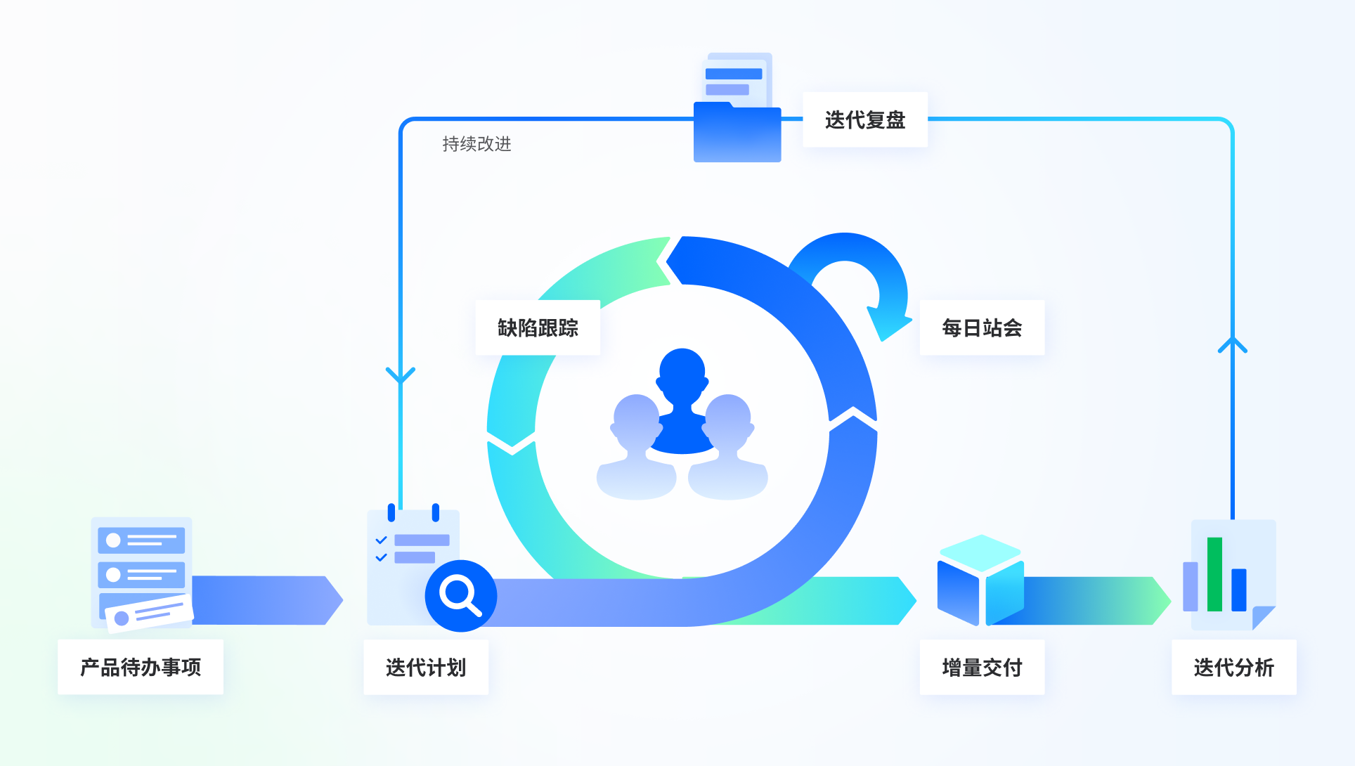提供包含项目管理、产品负责人、研发工程师、测试工程师等职能角色的完整解决方案,为需求管理、迭代规划、进度跟踪、迭代复盘等 Scrum 关键环节提供工具支撑。