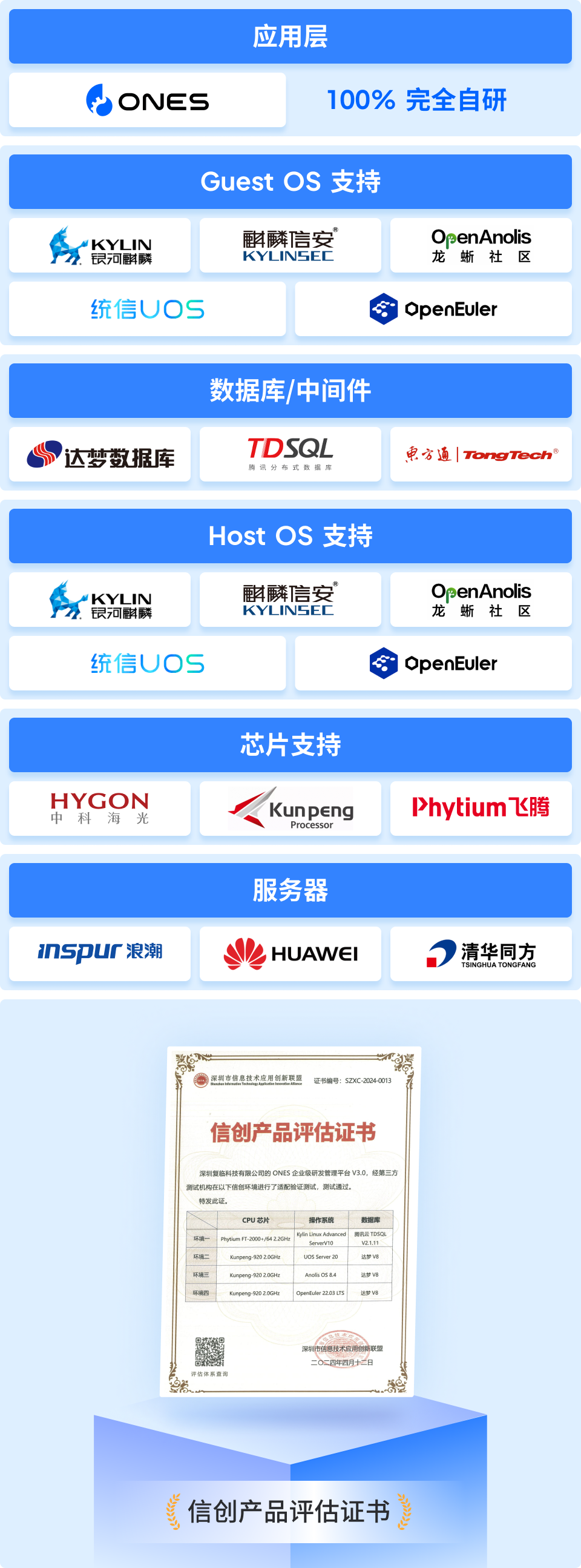 从产品研发、方案应用、生态适配到业务落地,ONES 形成了体系化的信创布局,帮助企业能够自上而下构建完全自主可控的 IT 体系